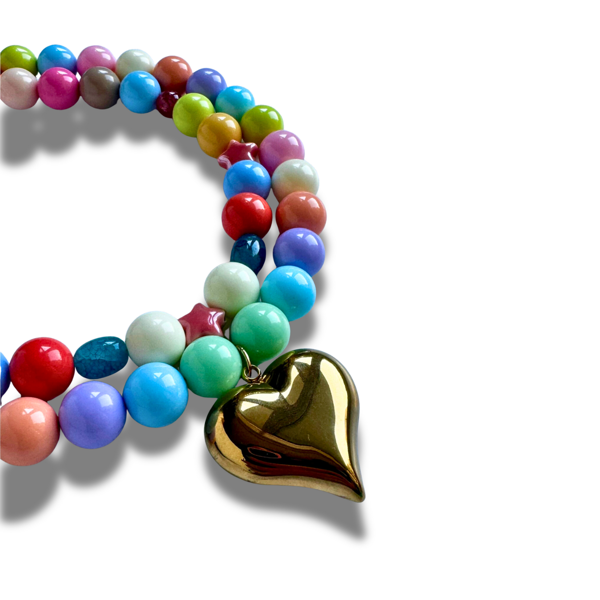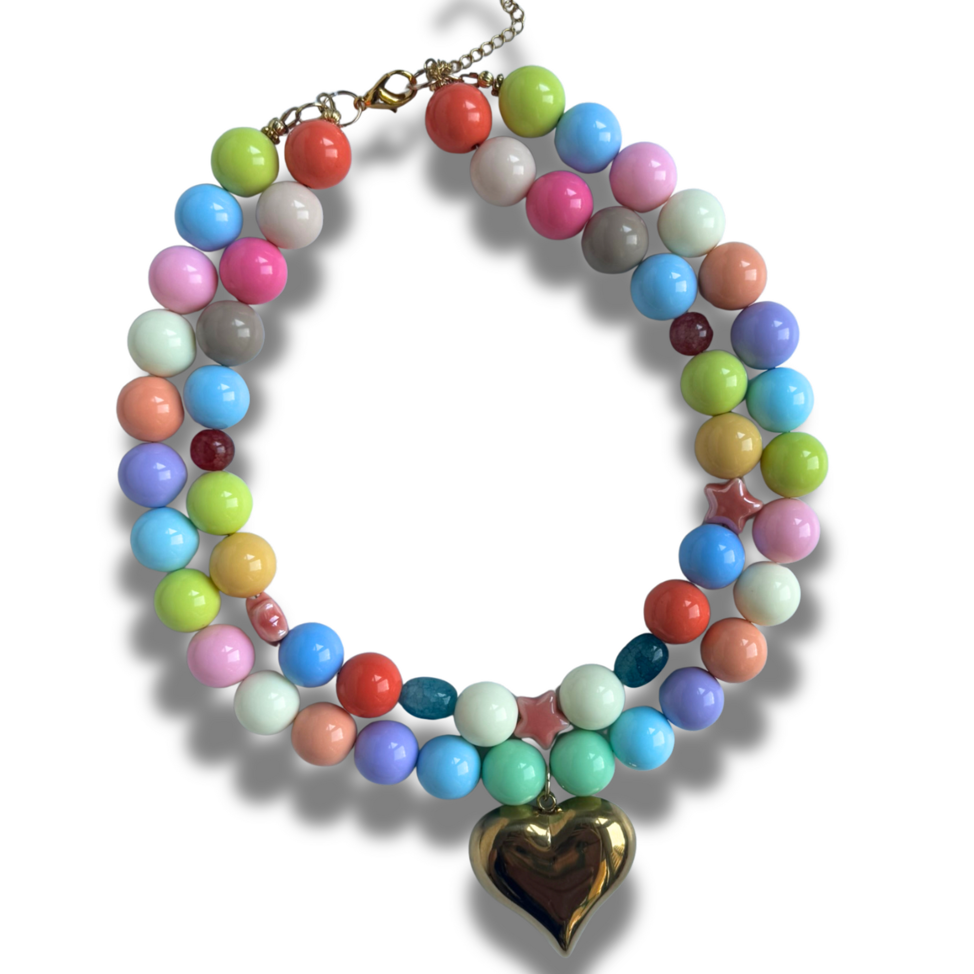 Love Bomb est un collier imposant, coloré et amusant. Ce collier double couche et audacieux est recouvert de perles, d'accents étoiles et d'un grand pendentif en forme de cœur, tout comme votre personnalité. Parfait pour superposer ou porter seul, pour les amateurs de dopamine dressing, ou chaque fois que vous voulez ajouter une touche d'énergie ludique à votre look.