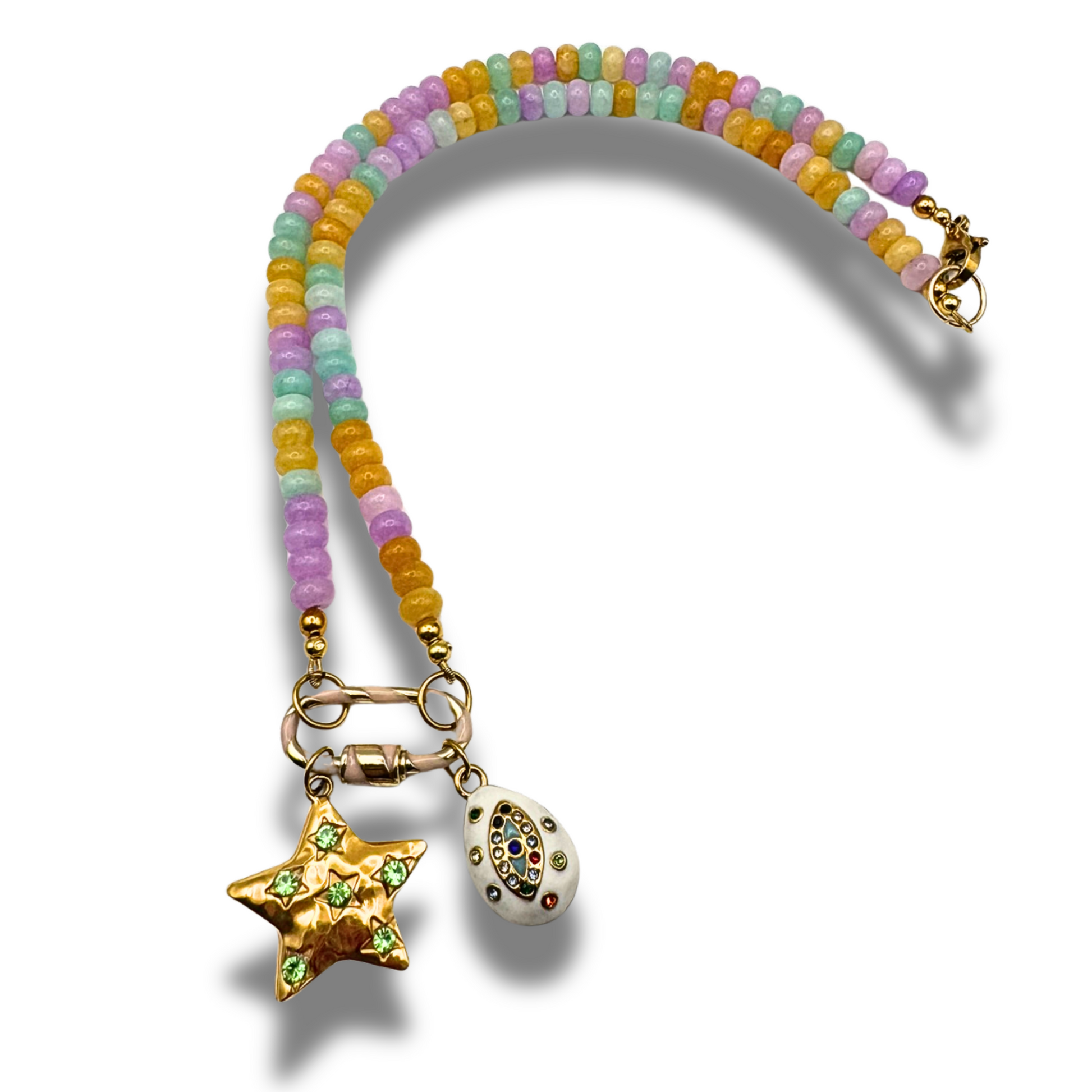This necklace brings instant good vibes. Made with candy-colored chalcedony beads and a pink-and-gold carabiner clasp at the front, it features a gold star with green rhinestones and a glossy evil eye charm. Personalize it your way: swap the charms, add new ones, or wear it as-is for a bold pop of colour.