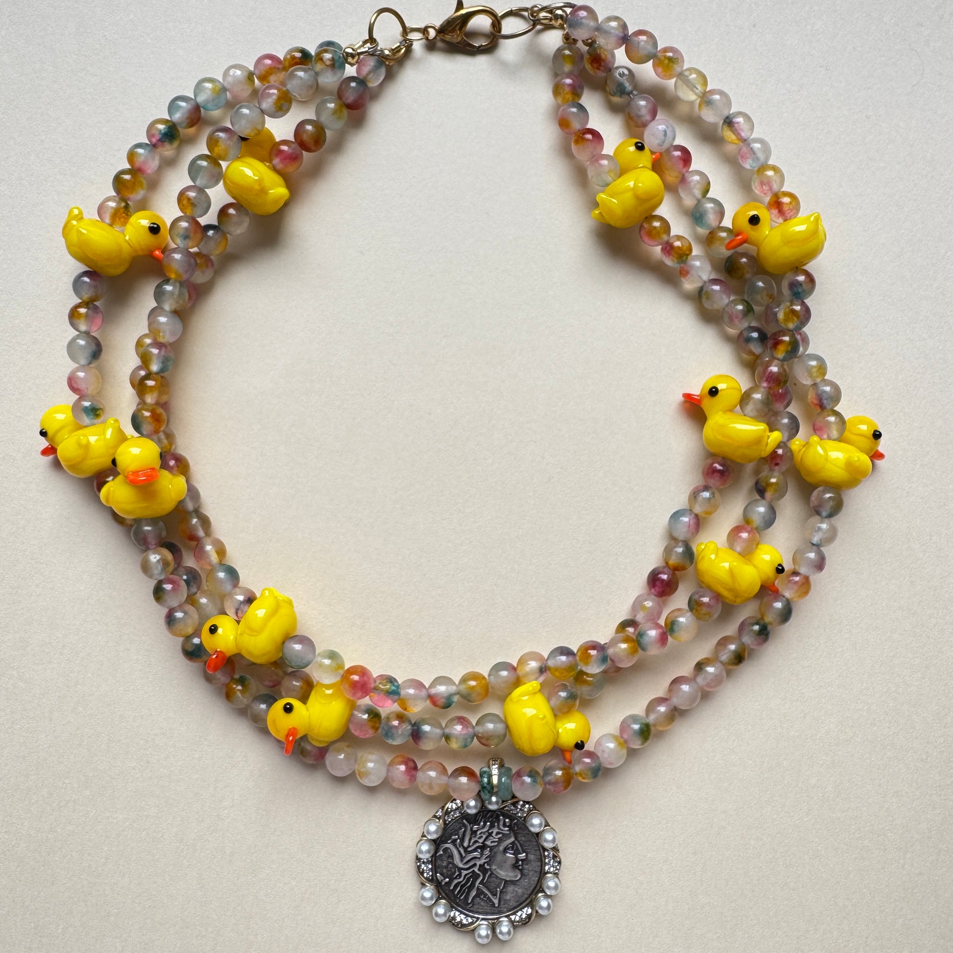 The Luck Duck Necklace is a triple-layered handmade statement piece featuring dyed jade beads, glass duck beads, and a pearl-accented coin pendant. Bold, playful, and perfect for adding instant personality to any outfit.